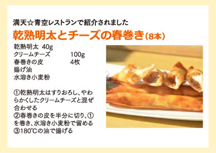 日本テレビ 「満天☆青空レストラン」内で宮川大輔さん・チャンカワイさんと【乾熟明太】を使った春巻きを作り、みんなで楽しみました。