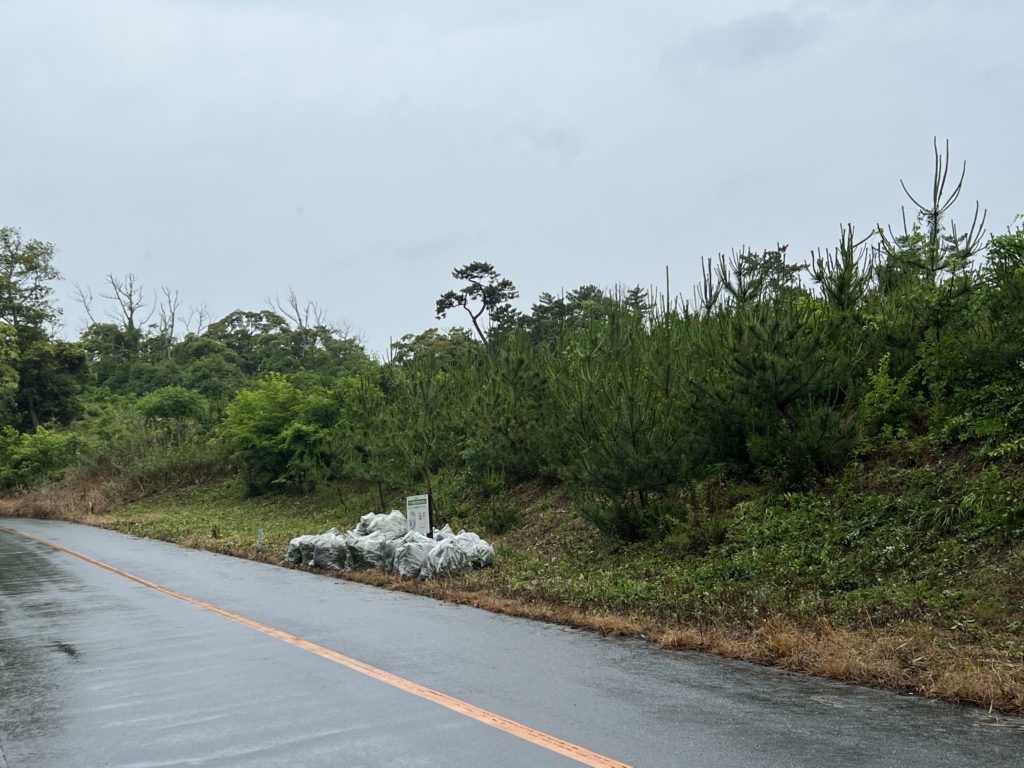 草刈り機で全体の草を大体刈り終わったかな…というころに雨が強まってきたため、刈った草を熊手で集め、袋に詰めて本日の草刈りは終了しました。今回の草刈りの成果は27袋。