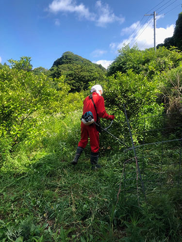 大島は甘夏みかんの栽培に適した土壌、気候のため、昔から栽培、収穫が盛んだったようです。手入れされている甘夏畑ももちろんいくつかありますが、島の方々の高齢化に伴い管理が難しくなってきていて、耕作放棄地になっている畑もあるようです。中には所有者の方々の意向で行政管理となっている畑もあります。弊社は、地域素材を活かした商品づくりに貢献する目的で、その甘夏みかん畑を1区画管理させていただいています。