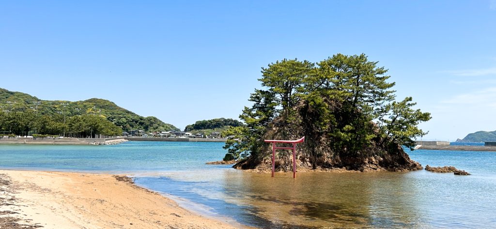 赤い鳥居と三角形の島が印象的な「かんす海水浴場」「かんす(干洲)」とは干潮時に現れる砂州のこと。干潮時には歩いて小島まで渡ることができますよ。海遊びや釣り、新鮮な海産物にバーベキューと遊びもグルメも楽しめます。魅力あふれる癒しスポット「大島」で夏休みを「楽しまんね!」